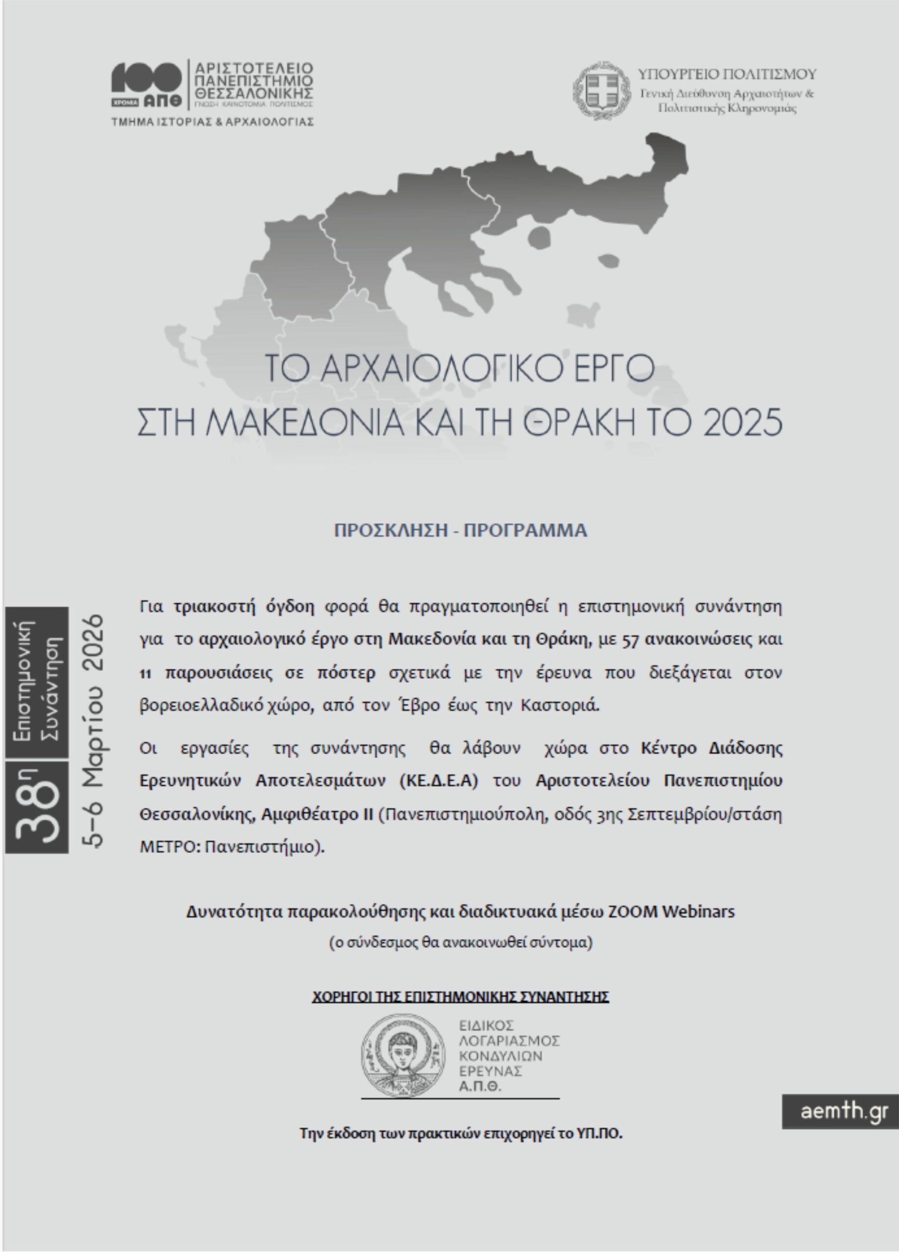 Για τριακοστή όγδοη φορά θα πραγματοποιηθεί η επιστημονική συνάντηση για το αρχαιολογικό έργο στη Μακεδονία και τη Θράκη, με 57 ανακοινώσεις και 11 παρουσιάσεις σε πόστερ σχετικά με την έρευνα που διεξάγεται στον βορειοελλαδικό χώρο, από τον Έβρο έως την Καστοριά.